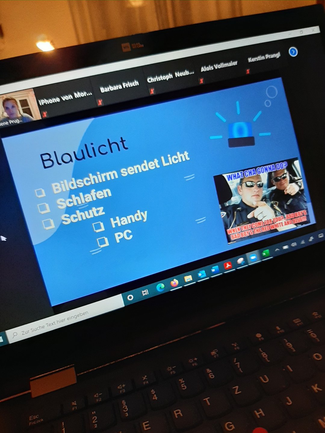 Ein weiterer Schwerpunkt war das Thema „Blaulicht“. Blaulicht wird von LED-Bildschirme ausgestrahlt, sprich Handy, Tablet und TVs. Blaulicht ist auch im Tageslicht vorhanden und genau das macht es so unberechenbar. Das Blaulicht signalisiert unserem Gehirn, dass es noch nicht Zeit ist schlafen zu gehen. Um nach einer langer Handy-Session am Abend besser einzuschlafen, sollte man einen Blaulichtfilter benutzen, welches jedes Handy ab 2016 schon besitzt. Durch den Blaulichtfilter wirkt der Bildschirm etwas orange.